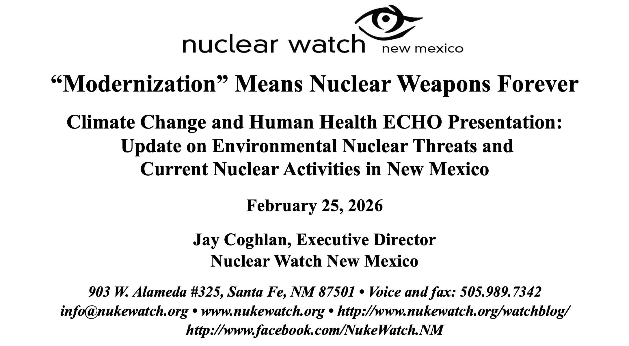Through comprehensive research, public education and effective citizen action, Nuclear Watch New Mexico seeks to promote safety and environmental protection at regional nuclear facilities; mission diversification away from nuclear weapons programs; greater accountability and cleanup in the nation-wide nuclear weapons complex; and consistent U.S. leadership toward a world free of nuclear weapons.