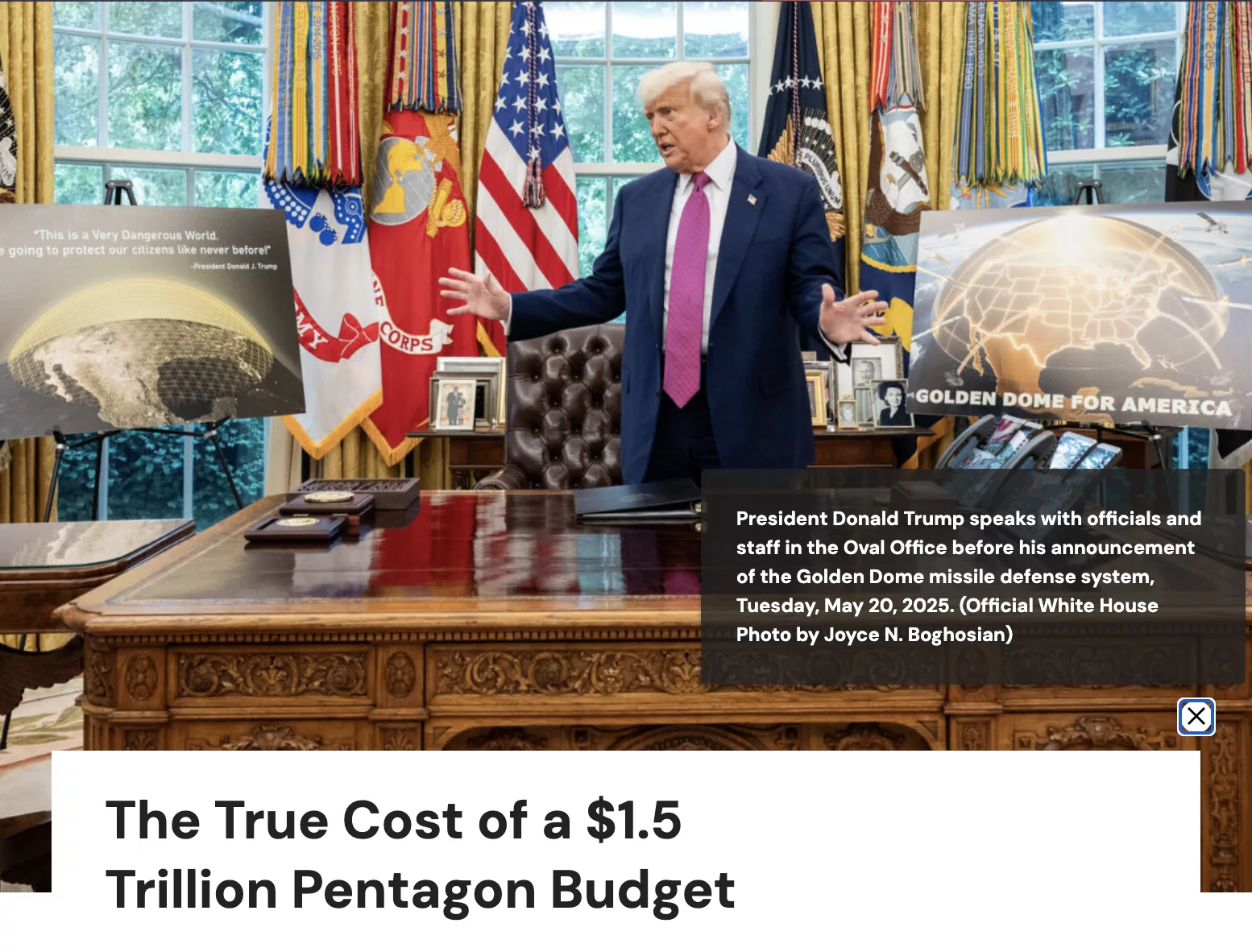 Trump is proposing to increase the military budget from $1 trillion this FY 2026 to $1.5 trillion next year. The largest single component in this will probably be his ill-conceived Golden Dome. In the Alice in Wonderland upside down world of nuclear weapons policies, defense is offense and offense is defense. Unrealistic ballistic missile defenses have always the enemy of nuclear disarmament, starting with Edward Teller’s lies to Reagan that kept him from signing a nuclear weapons ban treaty with Mikhail Gorbachev in 1986.
