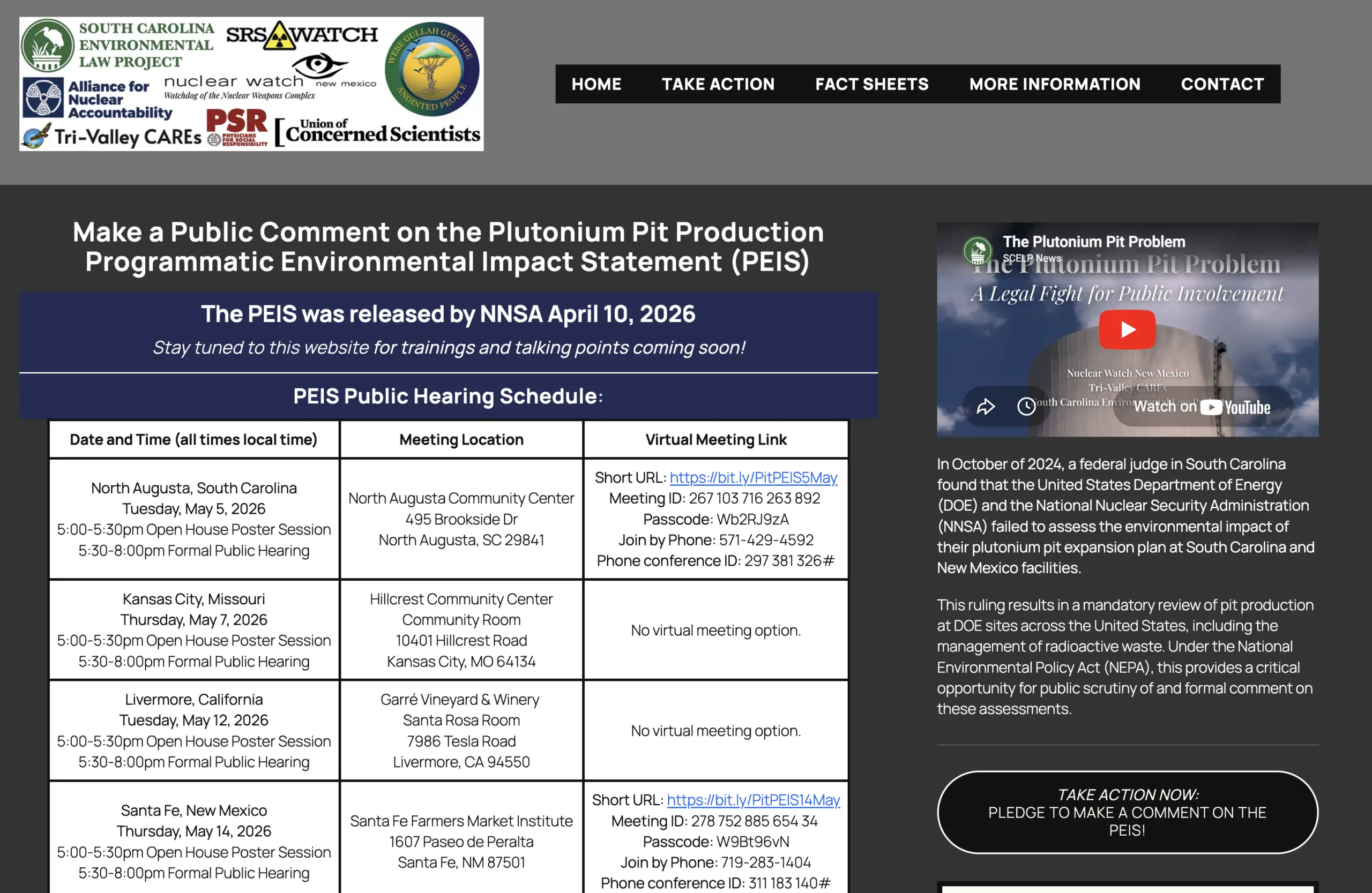 The Draft Programmatic Environmental Impact Statement (PEIS) for Plutonium Pit Production was released by NNSA on Friday, April 10th. This opens a critical window for public comment on NNSA’s unnecessary plan to expand production of plutonium “pit” bomb cores. This PEIS was brought on by a lawsuit against NNSA over its failure to complete the NEPA process for this plan. As you likely know, NEPA is fully under attack by the current administration — this may be the last foreseeable full NEPA process taking place, making it all the more critical to be involved.
