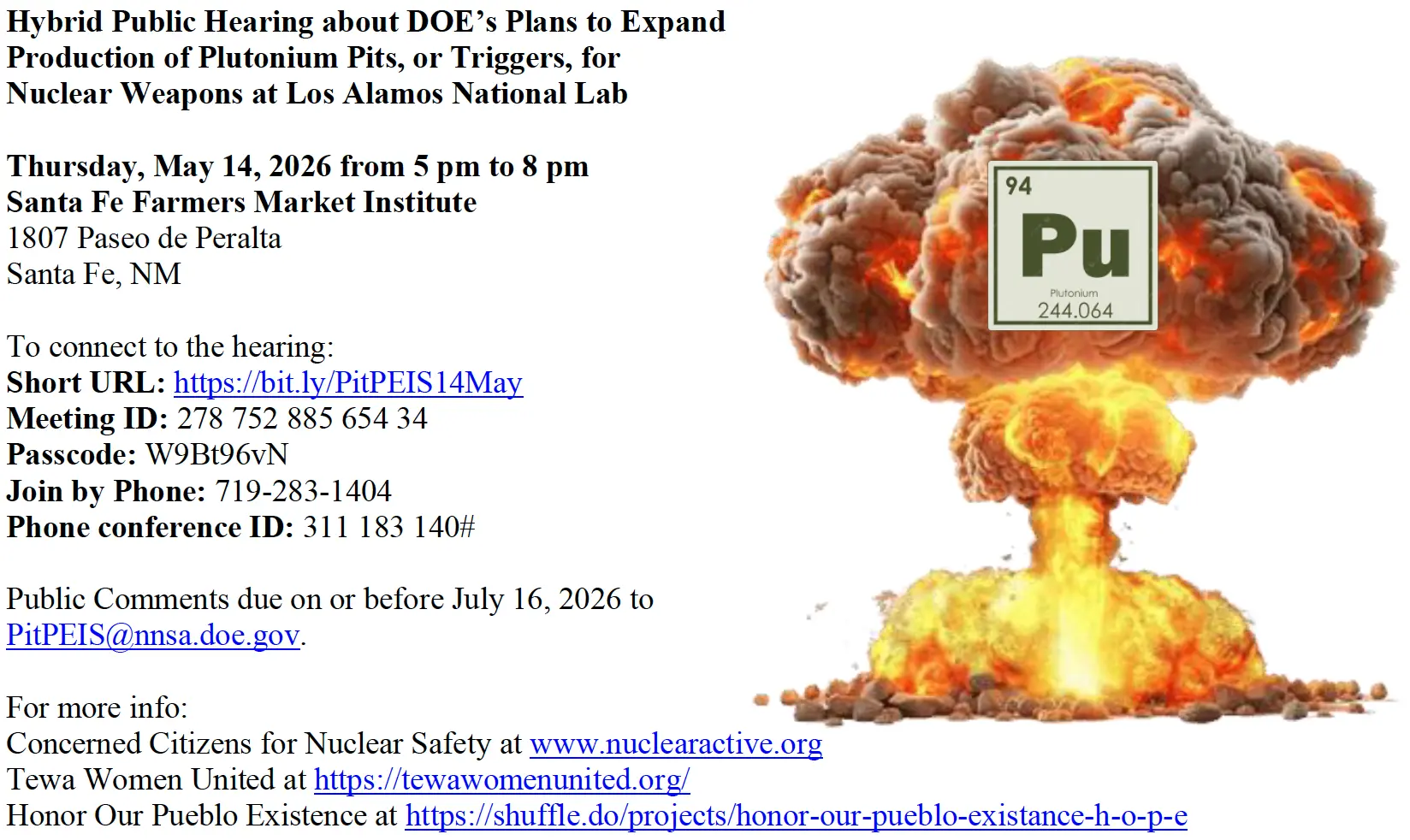 The Draft Programmatic Environmental Impact Statement (PEIS) for Plutonium Pit Production was released by NNSA on Friday, April 10th. This opens a critical window for public comment on NNSA’s unnecessary plan to expand production of plutonium “pit” bomb cores. This PEIS was brought on by a lawsuit against NNSA over its failure to complete the NEPA process for this plan. As you likely know, NEPA is fully under attack by the current administration — this may be the last foreseeable full NEPA process taking place, making it all the more critical to be involved.