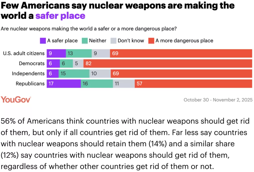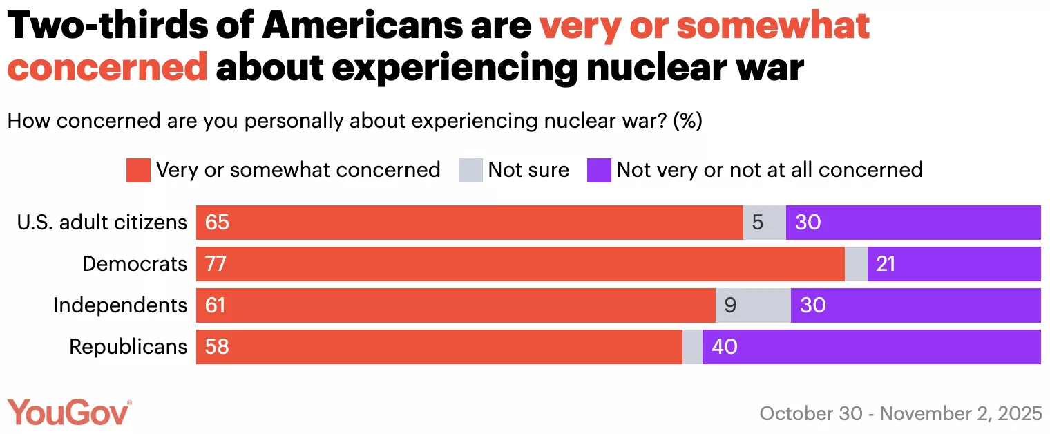 A new YouGov poll on nuclear weapons finds that nearly half of Americans believe it’s likely the U.S. will get into a nuclear war in the coming decade, and most are worried about personally experiencing a nuclear war. A majority believe nuclear weapons are making the world less safe, but opinions are mixed on whether the U.S. should dismantle all of its nuclear weapons.
