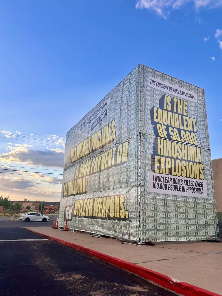 The event was organized by Nuclear Watch New Mexico in collaboration with the Up in Arms campaign by Ben Cohen, co-founder of Ben & Jerry's, to reduce military and nuclear weapons spending, the International Campaign to Abolish Nuclear Weapons (winners of the 2017 Nobel Peace Prize), the Santa Fe Archdiocese, the Back from the Brink New Mexico Hub, and the Tularosa Basin Downwinders Consortium. It centered around a massive public art installation from Up in Arms of a towering cubic structure framed by messages on top of images of $100 bills. The structure is sized to literally hold $100 billion of those bills, respresenting what the U.S. spends every year on nuclear weapons (the total cost of nuclear weapons "modernization" is up to $2 trillion). Visible to thousands of drivers each day, the large installation pressures viewers to reckon with the scale of this cost and to imagine what else those resources could make possible. A prominent message on one of the four sides quotes the president in saying, "'We don't need to build brand new ones. We already have so many,' — Donald Trump" and below it, "His budget includes a down payment of $2 trillion of nuclear weapons." Another side reads, "The current U.S. nuclear arsenal is the equivalent of 50,00 Hiroshima explosions. One nuclear bomb killed over 100,000 people in Hiroshima."