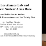 An Interfaith Remembrance of the Trinity Test” will be held at the Santa Maria de la Paz Community Hall in Santa Fe, featuring music, speakers, exhibitions, and moments of reflection and prayer. The free public event is 4-6 p.m. (doors open at 3:15 p.m.), Sunday, July 16, 2023. Pre-registration is encouraged, and the event will be live streamed.