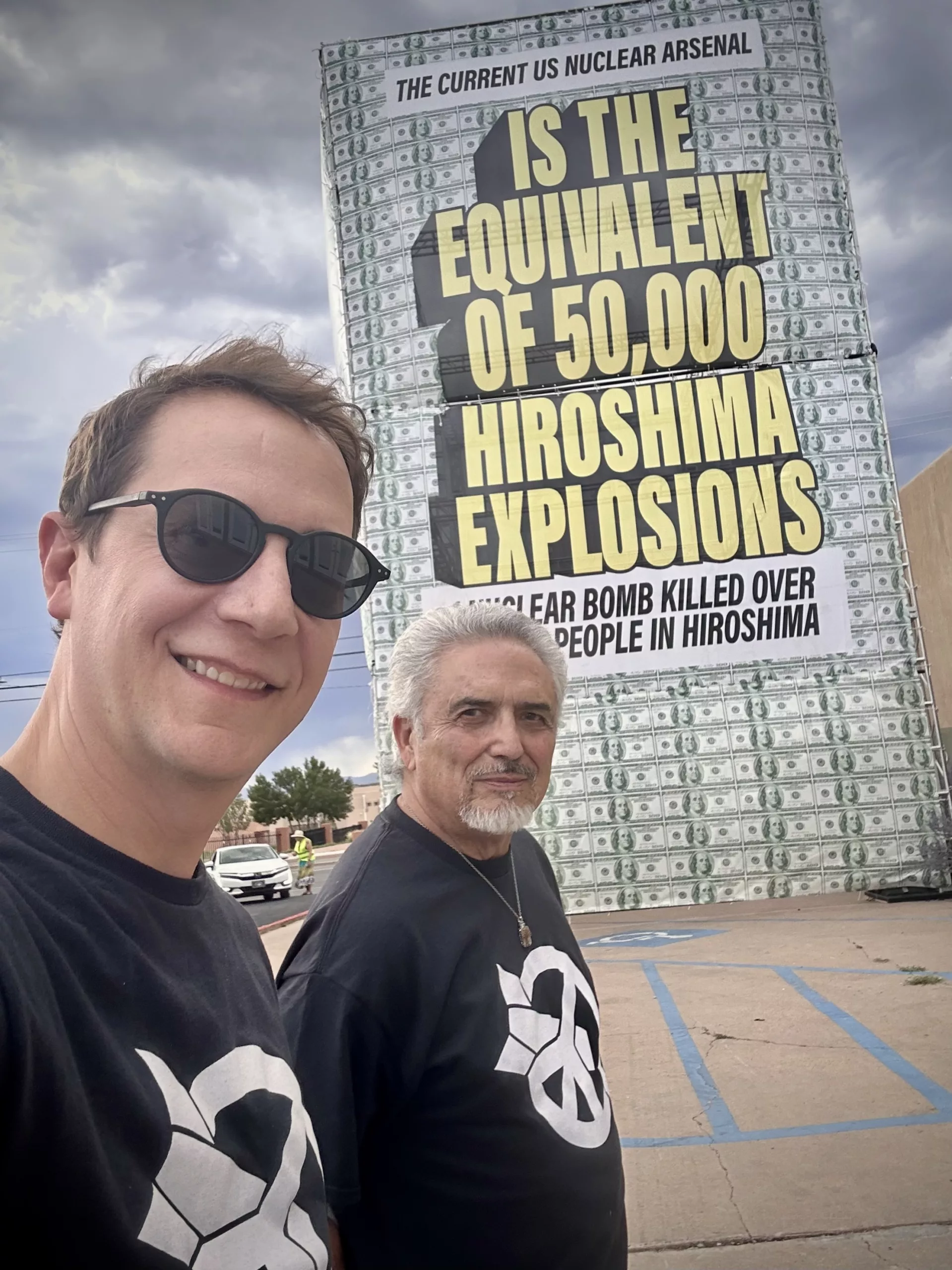 The event was organized by Nuclear Watch New Mexico in collaboration with the Up in Arms campaign by Ben Cohen, co-founder of Ben & Jerry's, to reduce military and nuclear weapons spending, the International Campaign to Abolish Nuclear Weapons (winners of the 2017 Nobel Peace Prize), the Santa Fe Archdiocese, the Back from the Brink New Mexico Hub, and the Tularosa Basin Downwinders Consortium. It centered around a massive public art installation from Up in Arms of a towering cubic structure framed by messages on top of images of $100 bills. The structure is sized to literally hold $100 billion of those bills, respresenting what the U.S. spends every year on nuclear weapons (the total cost of nuclear weapons "modernization" is up to $2 trillion). Visible to thousands of drivers each day, the large installation pressures viewers to reckon with the scale of this cost and to imagine what else those resources could make possible. A prominent message on one of the four sides quotes the president in saying, "'We don't need to build brand new ones. We already have so many,' — Donald Trump" and below it, "His budget includes a down payment of $2 trillion of nuclear weapons." Another side reads, "The current U.S. nuclear arsenal is the equivalent of 50,00 Hiroshima explosions. One nuclear bomb killed over 100,000 people in Hiroshima."