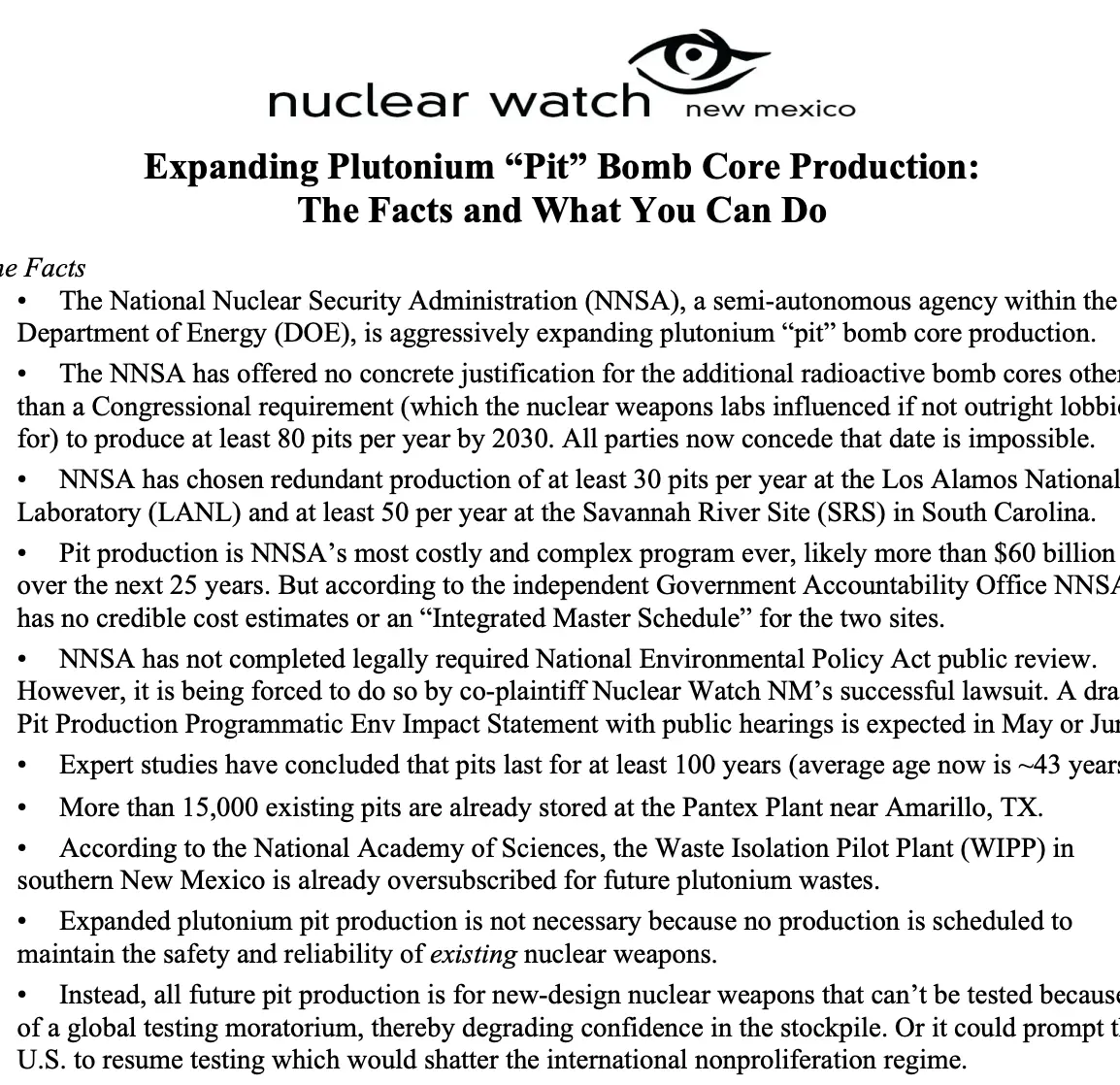 The rationale of DOE’s semi-autonomous nuclear weapons agency, the National Nuclear Security Administration (NNSA), is that Area C is within a few hundred yards of the Lab’s main facility for plutonium “pit” bomb core production. LANL is prioritizing that production above everything else while cutting cleanup and nonproliferation programs and completely eliminating renewable energy research. DOE’s and NNSA’s unilateral deferment of Area C until it “is no longer associated with active Facility operations” in effect means that it will never be cleaned up. No future plutonium pit production is to maintain the safety and reliability of the U.S.’ existing nuclear weapons stockpile. Instead, it is all for new design nuclear weapons for the new arms race that the NNSA intends to produce until at least 2050. Further, new-design nuclear weapons could prompt the United States to resume full-scale testing, which would have disastrous international proliferation consequences.