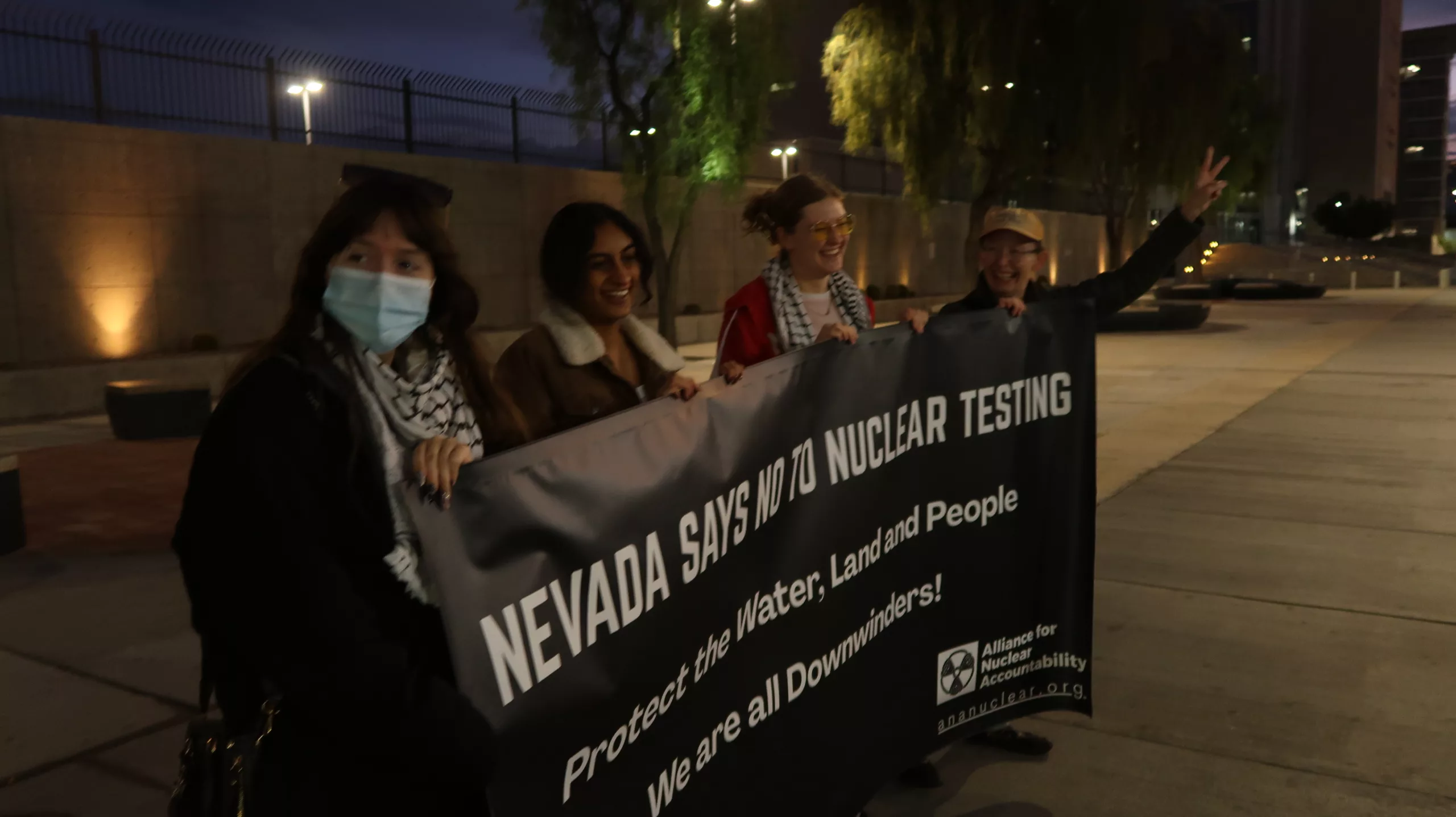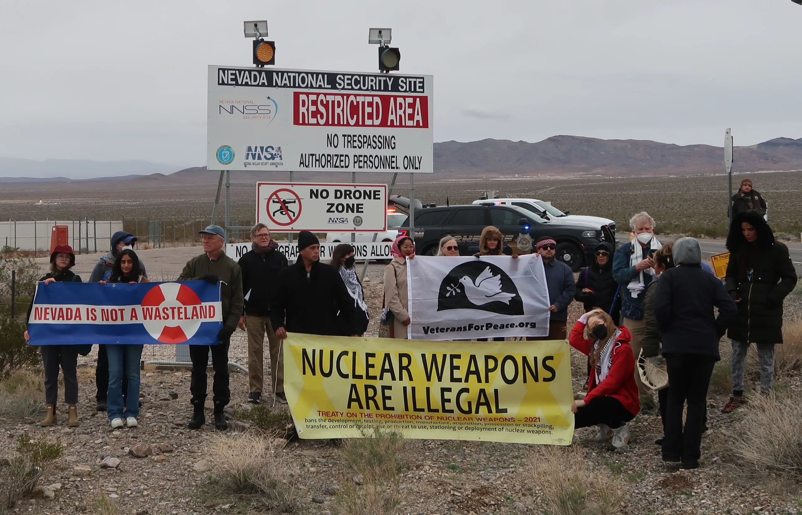 Friday morning, Nov. 21, the group traveled to the Mercury Exit gate of the Nevada Test Site with banners opposing nuclear weapons and nuclear testing. On October 29, before a meeting in South Korea with Chinese President Xi, President Donald Trump announced on social media that he “instructed the Department of War to start testing [U.S.] Nuclear Weapons on an equal basis” with Russia and China. The post contains various inaccuracies and ambiguity over whether he wants to resume underground nuclear explosive testing — an act the United States, Russia, and China have not undertaken in over 30 years — or continue testing of delivery systems.