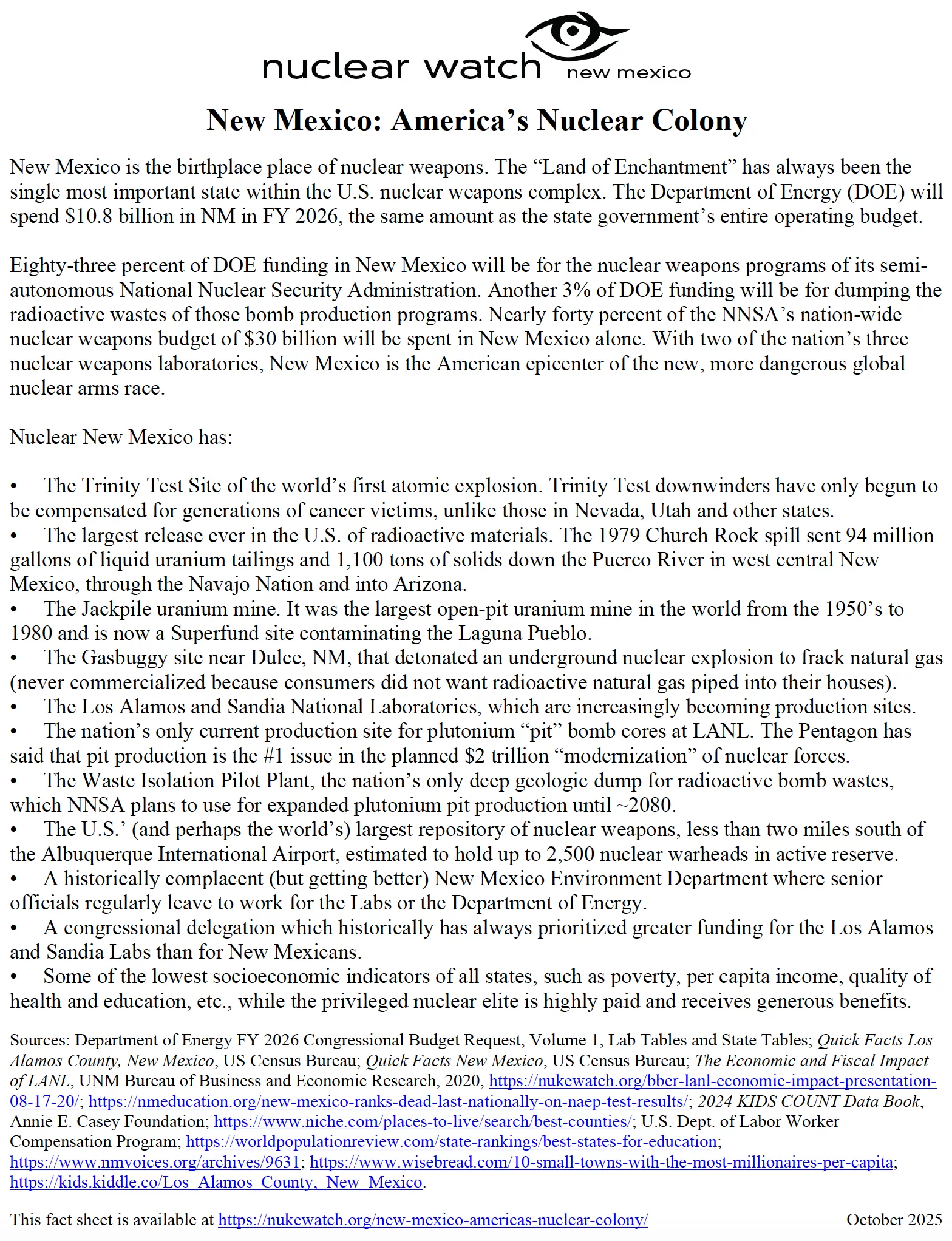 Santa Fe, NM – Topline budget figures for the Department of Energy (DOE) have been released under the headline of “Unleashing a Golden Era of Energy Dominance and Energy Innovation and Protecting the Nation.” But as a baseline, 65% of the Department’s proposed $46 billion budget is earmarked for its semi-autonomous nuclear weapons agency, the National Nuclear Security Administration (NNSA). In turn, more than 80% of NNSA’s proposed FY 2026 funding is for its nuclear weapons research and production programs, with a 25% funding increase over FY 2025.
